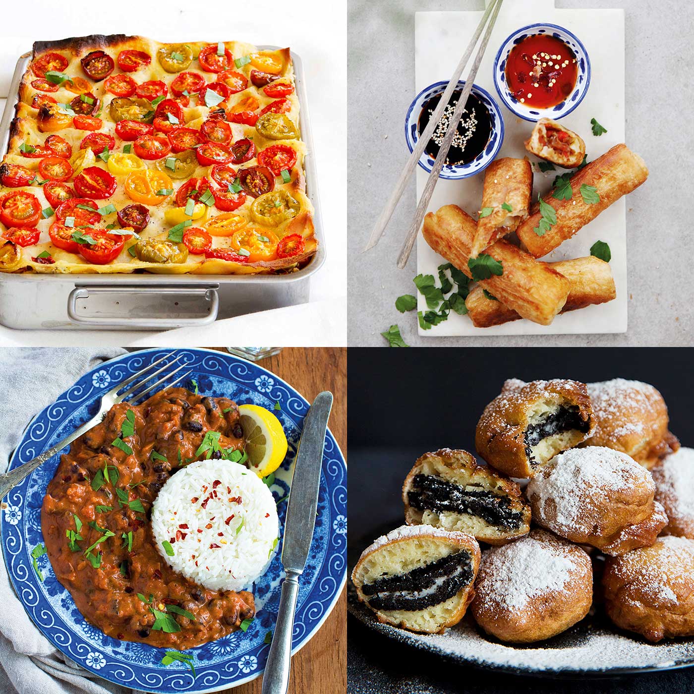 Testa att göra egna vegetariska vårrullar, en enkel souvlakiplåt med fetast eller billig och mustig bönstroganoff. Ja, eller vår mest grönsaksmaxade vegolasagne.