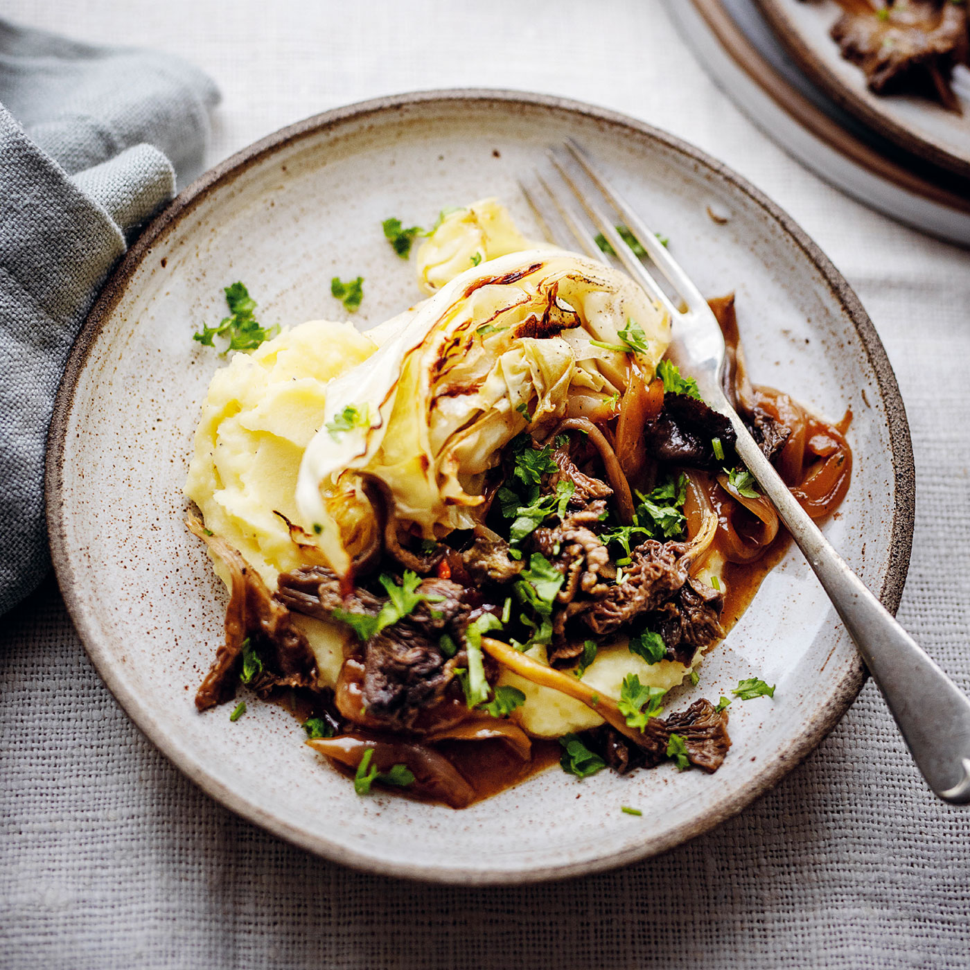 Det är lite pyssel med den här rätten, men väl värt besväret. För tänk dig belöningen när du sitter till bords och njuter av krämigt potatismos tillsammans med stekt lök och svamp smaksatt med lite fin vinäger. Det och ugnsbakad spetskål är en rätt som tillfredsställer alla sinnen och ger matglädje.