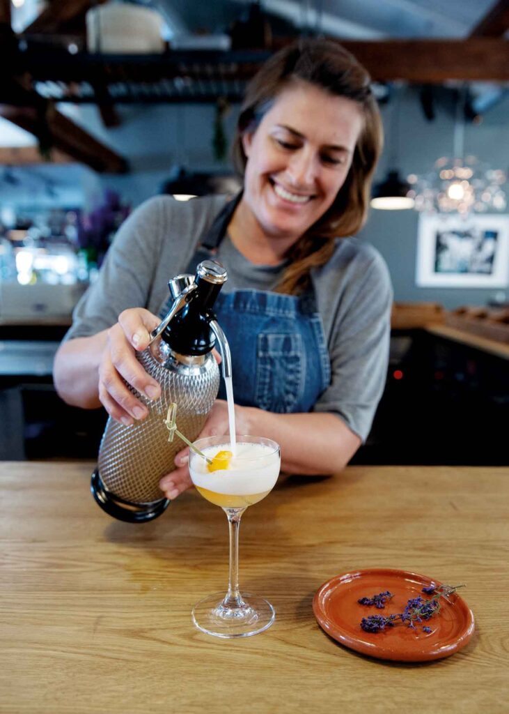 När gästerna kommer välkomnas de med en martini där oliven har ersatts med syrad pumpa. Det finns nämligen inte tillräckligt mycket pumpa kvar från höstens skörd för att det ska räcka till en hel rätt. Så då fick det bli ett gott tillbehör i drinken i stället.