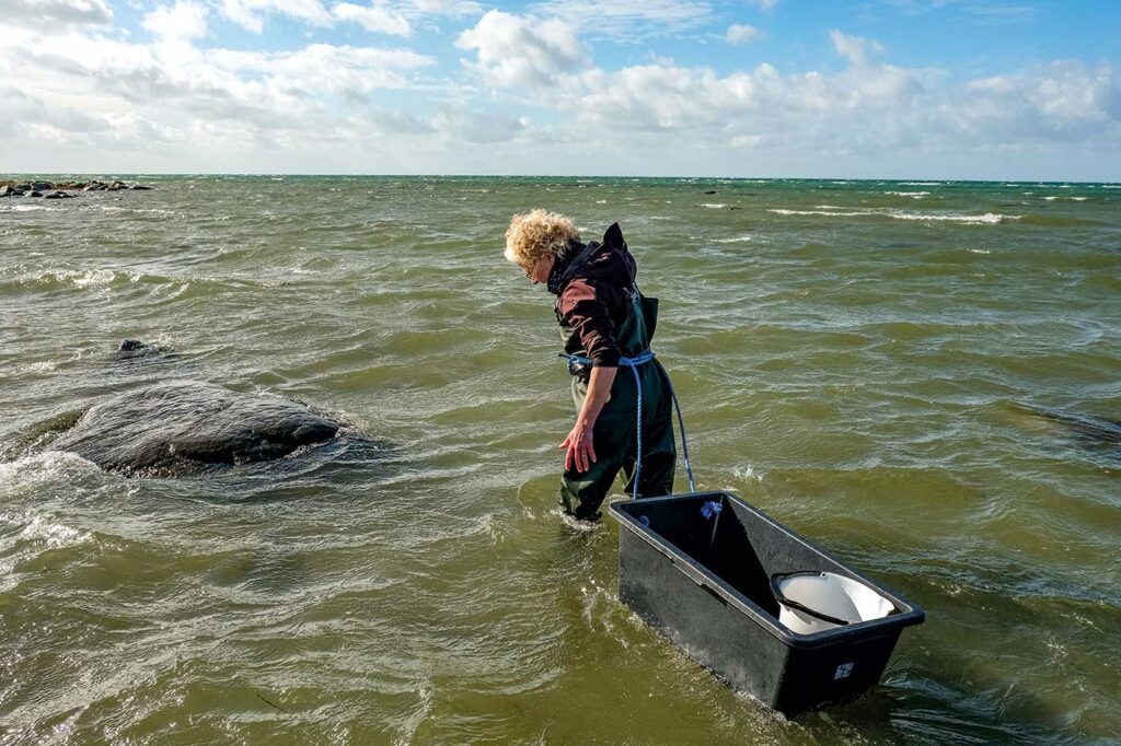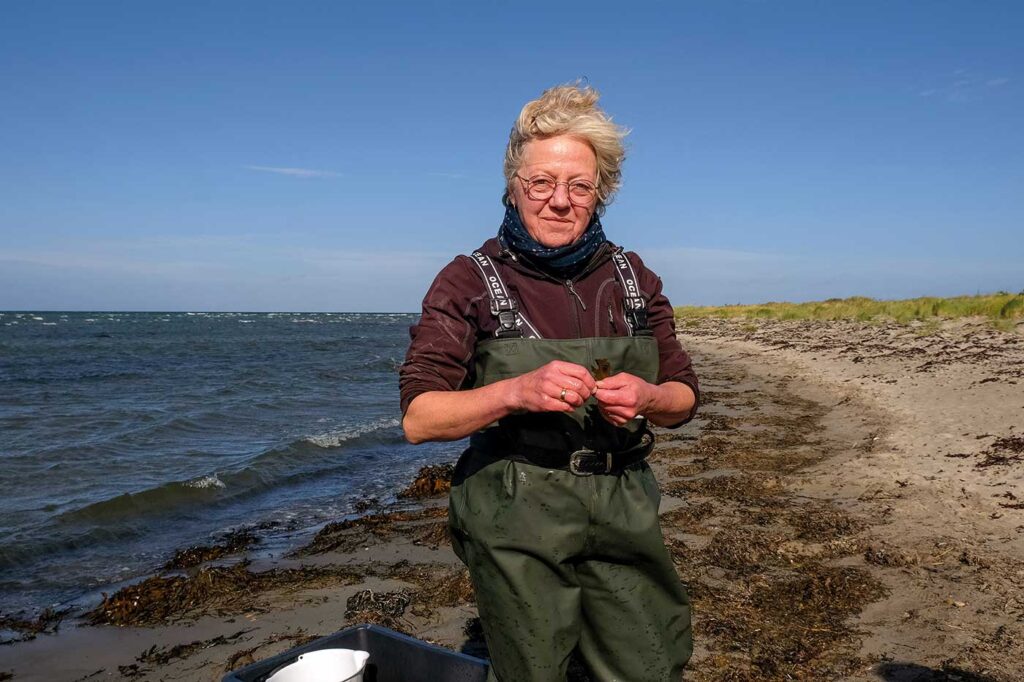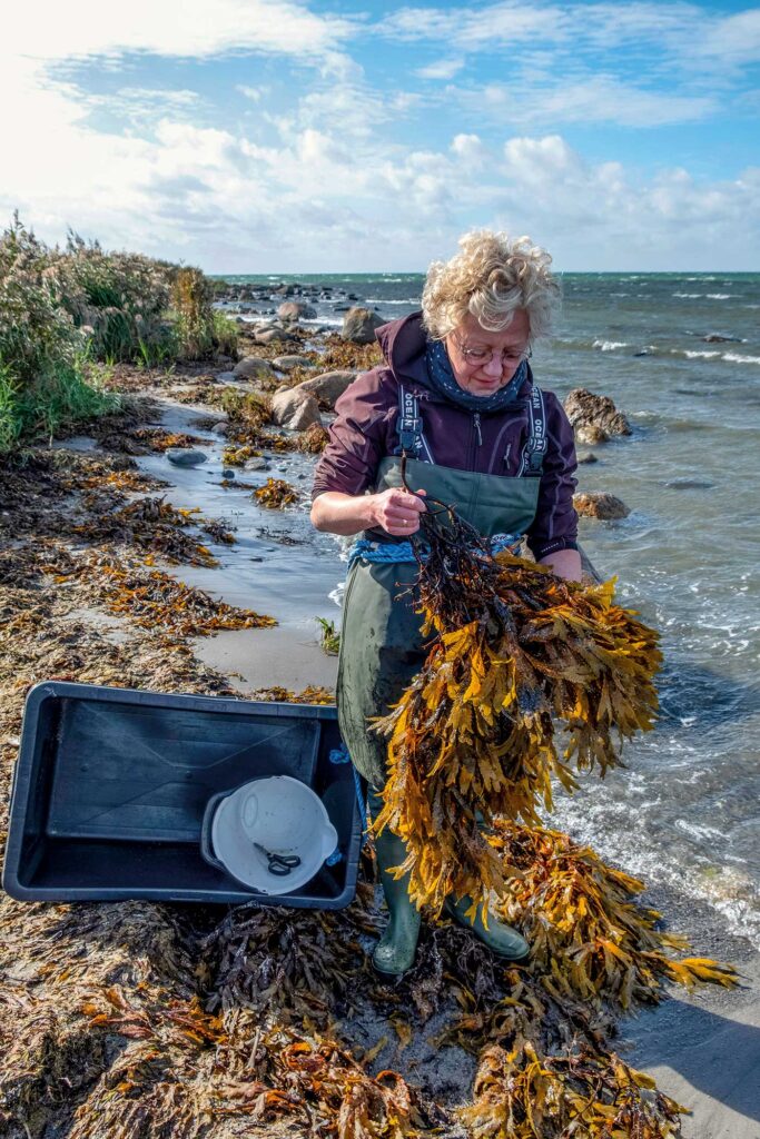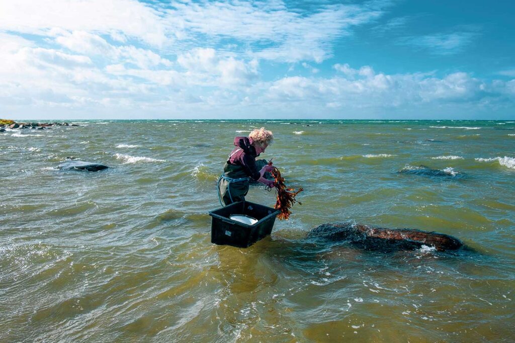 Nere vid stranden knyter Rie fast sin insamlarlåda i ett rep runt midjan. En låda som sedan flyter bakom henne medan vi vandrar ut i vågorna. Med vant kännaröga väljer Rie ut den bästa tången och klipper av den med en sax. Det finns över 200 arter av tång kring Læsø. Experten Rie vet exakt vilka som är godast.