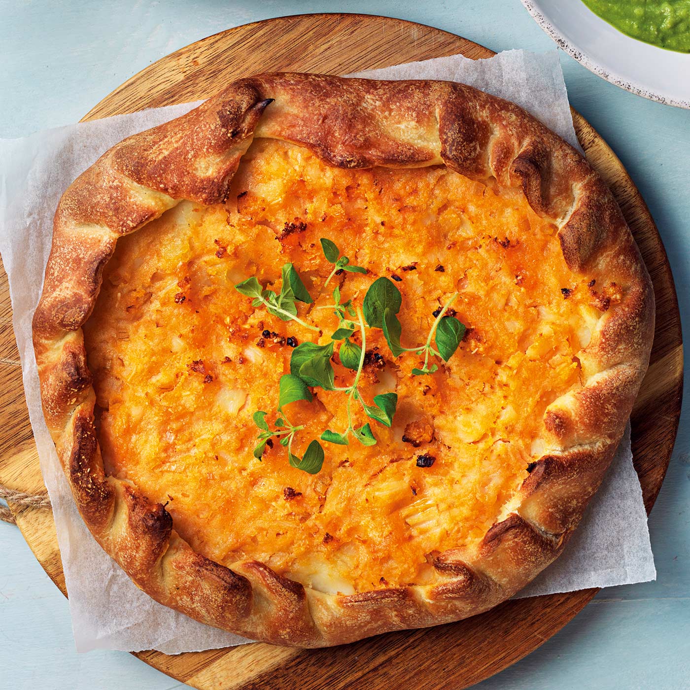 Det här är en hyfsat klassisk grönkålspaj med tofustanning, toppad med päron och valnötter. Ett givet måste på julbordet!
