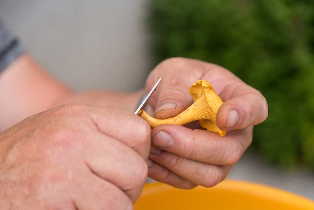 Rensa svampen direkt i skogen om du kan – skär bort jordiga fotändar och borsta av barr och mossa. Hemma kan du använda en svampborste eller liten pensel för att ta bort smuts. Undvik att skölja kantareller i vatten, de suger åt sig och förlorar smak och konsistens. Är de mycket jordiga kan du snabbt skölja dem i durkslag, men låt dem sedan torka på hushållspapper.