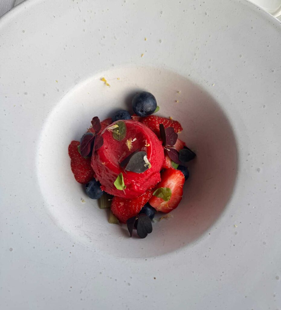 Middagen avslutades med en rabarbersorbet och bär (om du väljer veganskt). Ett enkelt och fint avslut.