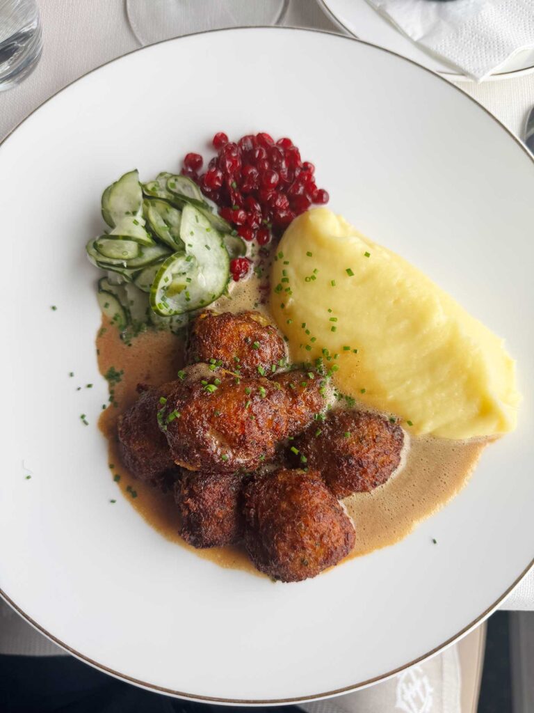 Och då till rätten som inte bara är ett kulinariskt initiativ – det är ett statement. Grand Hôtels första One Planet Plate-rätt är en klimatsmart tolkning av köttbullar, med växtbaserade bullar gjorda på en blandning av ekologiska grönsaker, rotfrukter och baljväxter. De serveras med potatismos, en gräddsås (på sojagrädde), lingonsylt och pressgurka.